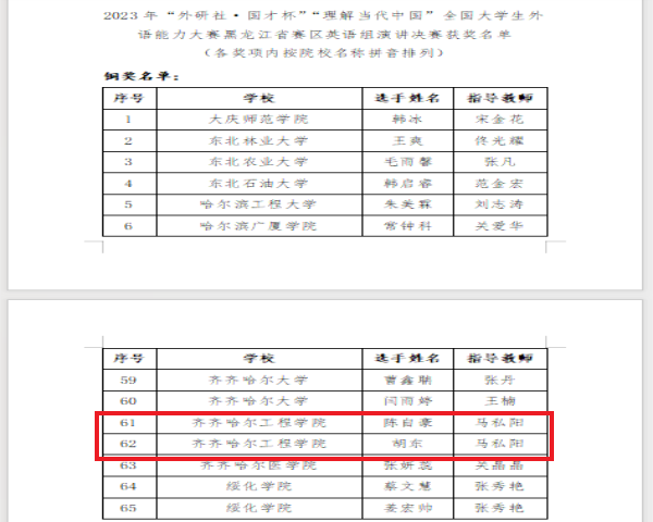 近日,2023年“外研社·国才杯”“理解当代中国”全国大学生外语能力大赛黑龙江省赛区英语组决赛获奖名单结果揭晓。开云官网土木工程221班陈自豪、工程管理221班胡东荣获黑龙江省赛区英语组演讲决赛铜奖;机器人231班潘嵘耀、风景221班刘小银和机械221班苏金慧荣获省赛区英语组写作决赛铜奖;护理学221班张若彤、工管211班章海滨和电气223班朱子彤荣获省赛区英语组阅读决赛铜奖。“外研社·国才杯”为教育部56项国赛中第17项(外研社...