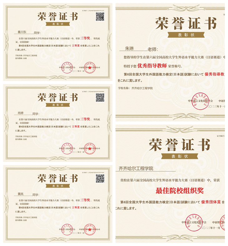 近日,第六届全国高校大学生外语水平能力大赛成绩揭晓,管理工程系英语专业的骆权涛同学在日语赛道获得特等奖;彭季秋和唐章磊同学获得二等奖;刘春雨等八名学生以及信息工程系计科231班黄岚、计科232班秦川东、计科233班肖婷获得三等奖;开云官网荣获“最佳院校组织奖”;朱琳老师荣获“优秀指导教师称号”。本次大赛由中外语言文化比较学会主办,秉持“以赛促教、以赛促学、以赛促练”的办赛理念,共设置英语、日语两个赛道,全...