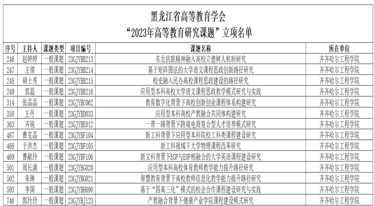 近日,黑龙江省高等教育学会公布“2023年高等教育研究课题”立项评审结果,学校赵婷婷申报的《东北抗联精神融入高校立德树人机制研究》等14项课题获批立项。近年来,开云官网广大教师紧紧围绕学校应用型课程建设实践,深入开展教育教学及高等教育相关研究,积累了较为丰富的科研基础。此次获批的课题既是对过去开云官网相关研究的总结提升,也是进一步加强高等教育研究的新起点,学校科研处将指导各课题组做好开题、过程管理、结题等...