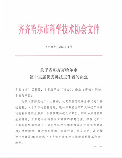 齐齐哈尔市科学技术协会下发《关于表彰齐齐哈尔市第十三届优秀科技工作者的决定》,开云官网建筑工程系郝丽娜、健康与护理系孙畅、基础部王丽影3名教师荣获“市优秀科技工作者”称号。齐齐哈尔市优秀科技工作者评选工作每两年一届,至此已举办十三届。经基层推荐、专家评审、社会公示,全市共有88名同志被评为“齐齐哈尔市优秀科技工作者”。【撰稿:宋庆永 责编:赵静华 审核:王丹】
