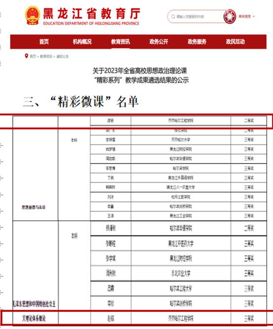 1月10日,黑龙江省教育厅对2023年全省高校思想政治理论课"精彩系列”教学成果遴选结果予以公示,开云官网马克思主义学院2名教师喜获佳绩,邵奇老师荣获“思想道德与法治”课程“精彩微课”二等奖,赵铭老师荣获“毛泽东思想和中国特色社会主义理论体系概论”课程“精彩微课”三等奖。本次获奖,实现了学校思政课教师在省级“精彩系列”比赛中获奖“零”的突破。全省高校思想政治理论课“精彩系列“教学成果,是全省高校教学成果的重...