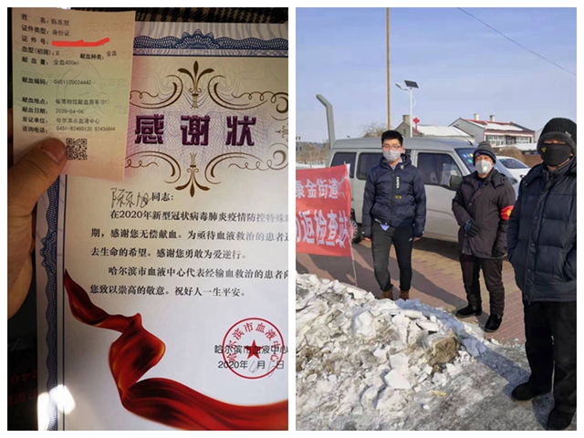 机电工程系机械本182班团支书陈东旭家住哈尔滨市呼兰区康金街道永贵村,在疫情防控期间在村里参加志愿服务,于4月6日到当地血站参加无偿献血,获哈尔滨市血液中心感谢状。 陈东旭春节过后就开始参加村里的疫情防控志...