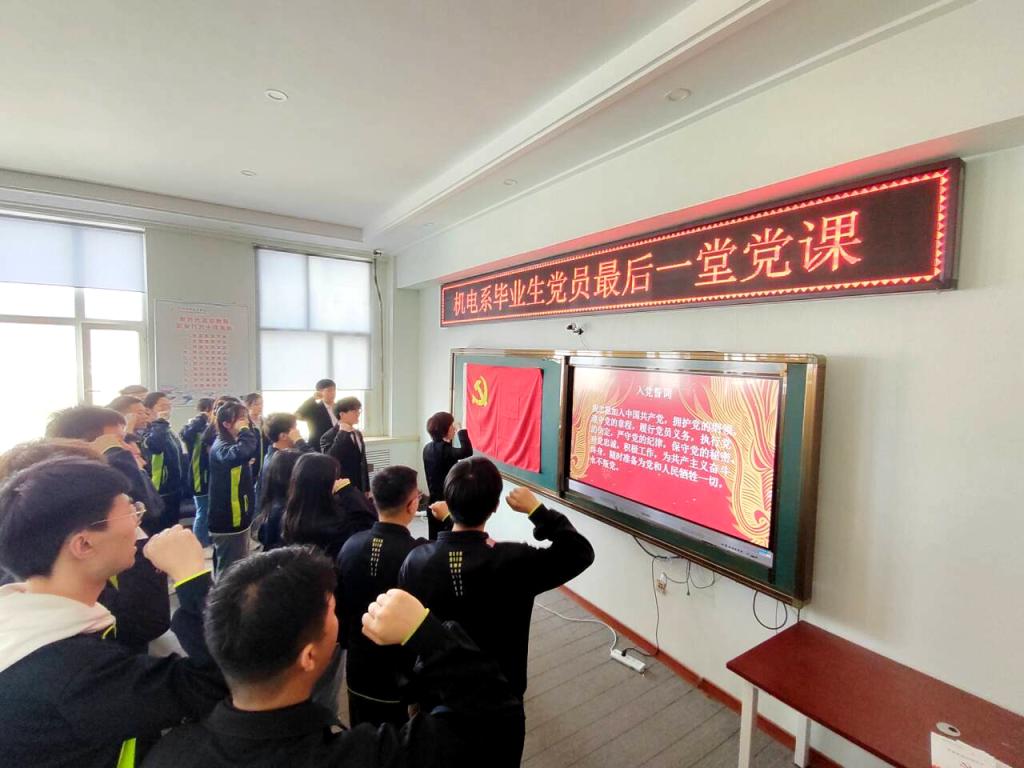 党旗引领铭初心,奋楫扬帆再出发。5月16日,机电工程系在图书馆608室开展毕业生党员最后一课活动。机电工程系党总支书记刘微、党总支副书记于海龙、党总支宣传委员吕嵩岩、汽服学生支部宣传委员王洪春、机械学生支部书记肖璐以及毕业生党员代表、在校学生党员共计50余人参加。活动开始,面对鲜红的党旗,在吕嵩岩的领誓下,全体党员重温入党誓词。铿锵有力的誓言响彻教学楼,激起了党员们戮力同心、不懈拼搏的决心和斗志。随...